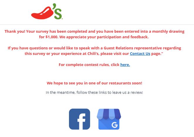 At last, Wishing you all the best for your Chili’s Customer Experience Survey. I hope you will be the winner of this survey and get a reward of $1000.